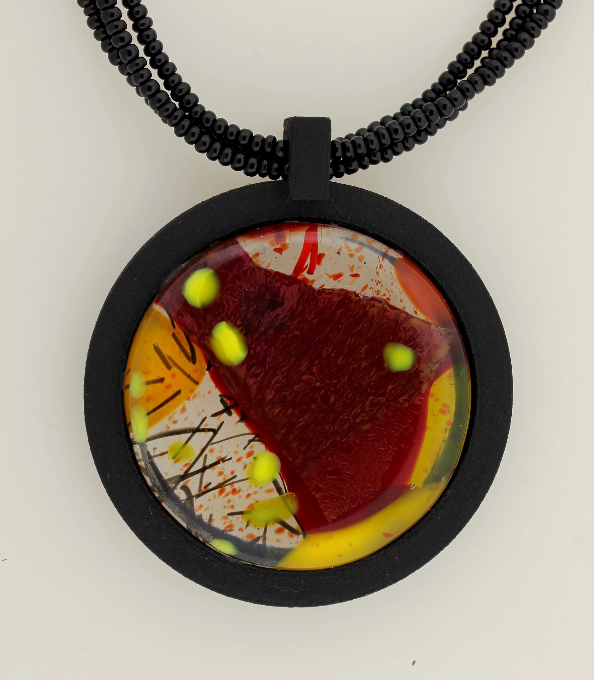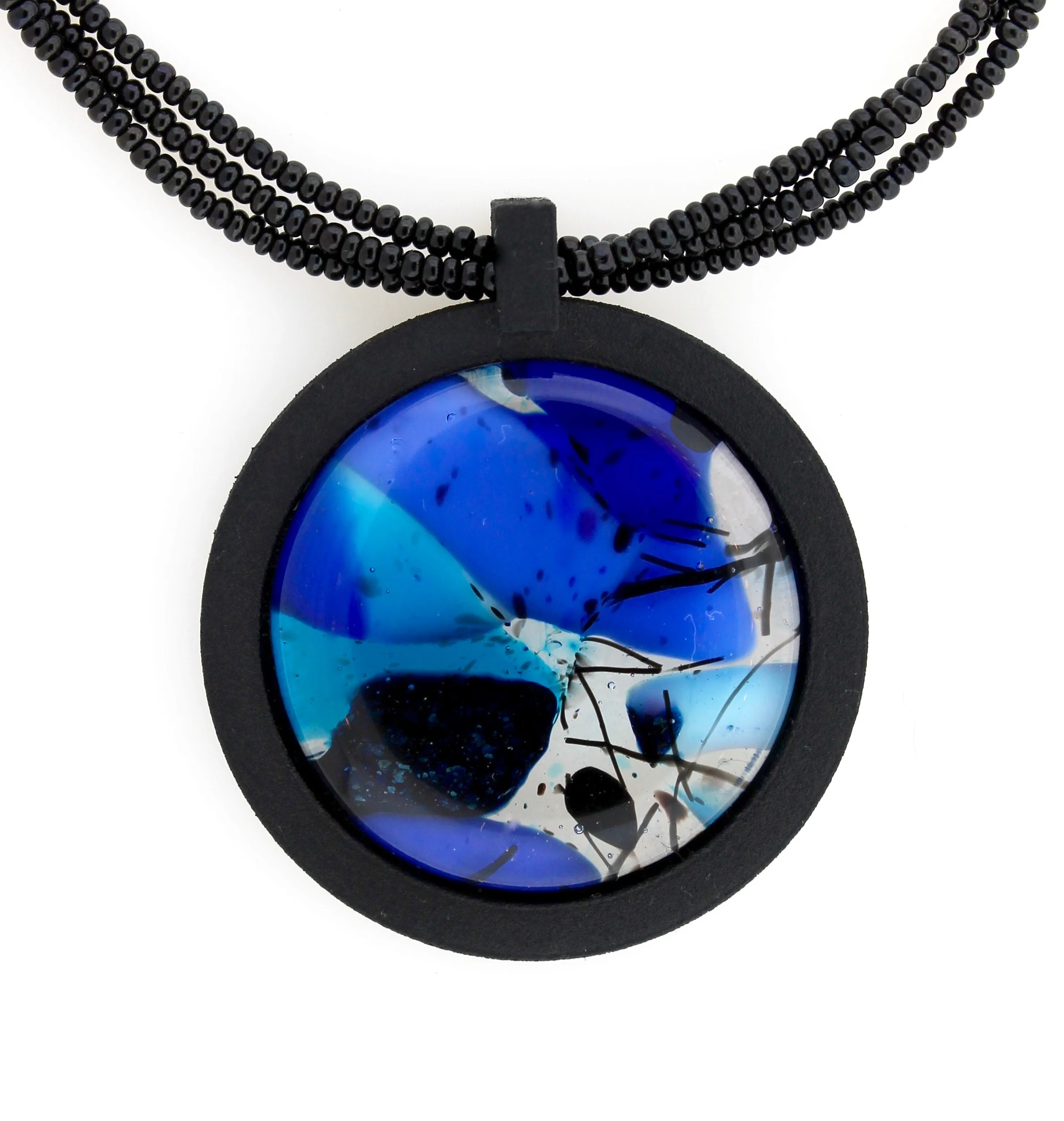 Cameo takes glass in a new direction. Glass discs are surrounded by a studio-designed, 3D printed cage and hung from three strands of black glass seed beads with a magnetic clasp.